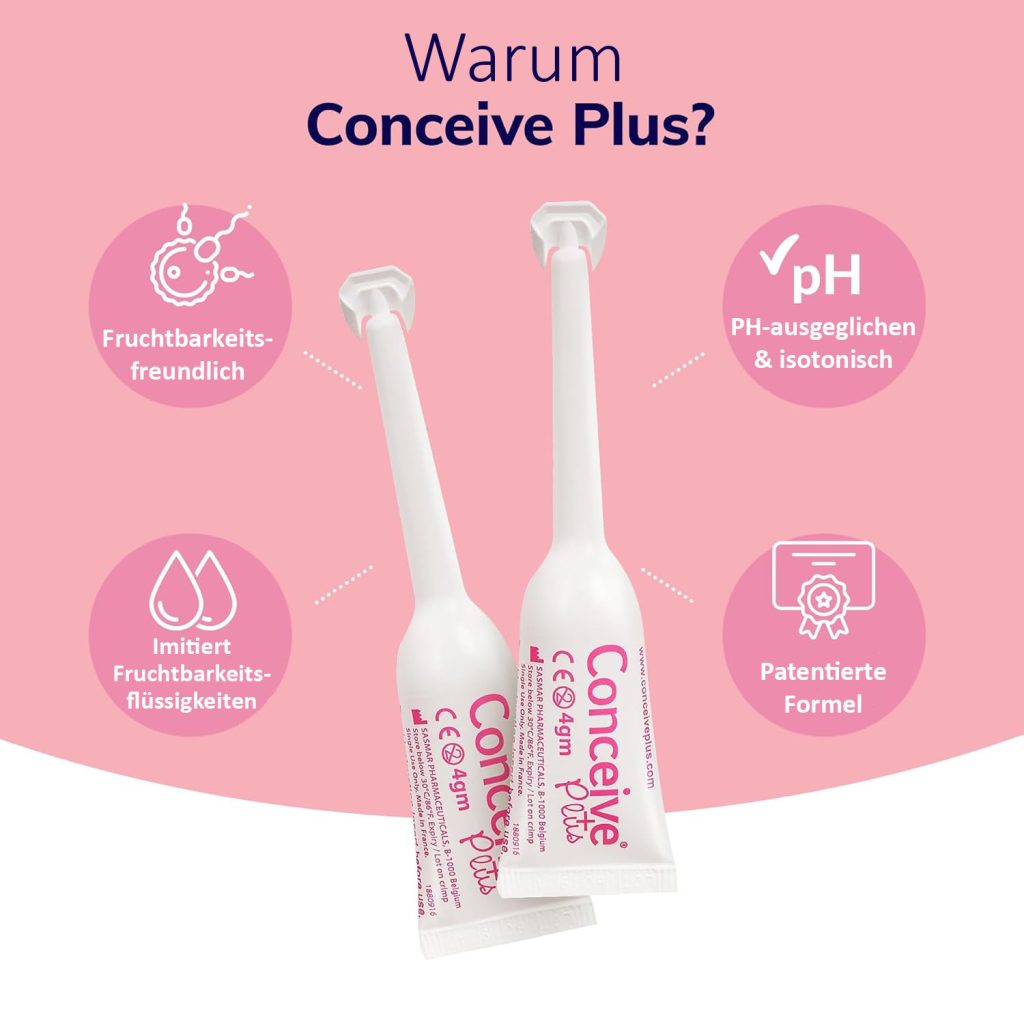 Conceive Plus® ist ein persönliches Gleitmittel zur Anwendung am Penis und/oder in der Scheide, das dazu bestimmt ist, den Penis zu befeuchten und zu schmieren, die Leichtigkeit und den Komfort der intimen sexuellen Aktivität zu verbessern und die natürliche Befeuchtung des Körpers zu ergänzen. Conceive Plus® ist mit Sperma, Eizellen und Embryonen kompatibel und kann von Paaren, die versuchen, schwanger zu werden, verwendet werden. Dieses Produkt kann bei Fruchtbarkeitseingriffen verwendet werden, um das Einführen von diagnostischen und therapeutischen Geräten in die Scheide zu erleichtern. Conceive Plus® ist mit Naturlatex und Polyurethan-Kondomen kompatibel. Dieses Produkt ist nicht zur Verwendung mit synthetischen Polyisoprenkondomen geeignet.