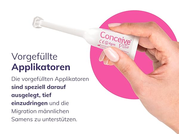 Das Conceive Plus Fertilitätsgel wird bequem über einen Einweg-Applikator verabreicht, der direkt in die Scheide eingeführt wird. Nach dem Entfernen der Sicherheitslasche, halten Sie das schmale Ende nach oben, drehen die Lasche ab und führen den Applikator tief ein. Durch 2-3 Drücker auf den Kolben wird das Gel gleichmäßig in die Vaginalhöhle verteilt. Entfernen Sie den Applikator, während Sie weiter drücken, und entsorgen Sie ihn anschließend. Jeder Applikator enthält 4 Gramm Gel und ist für den einmaligen Gebrauch bestimmt. Das Gel kann 10-15 Minuten vor der sexuellen Aktivität angewendet werden, um die Feuchtigkeit zu optimieren. Für zusätzliche Feuchtigkeit empfehlen wir die Conceive Plus®-Mehrfachtuben. Diese können zusammen mit den vorgefüllten Applikatoren verwendet werden.