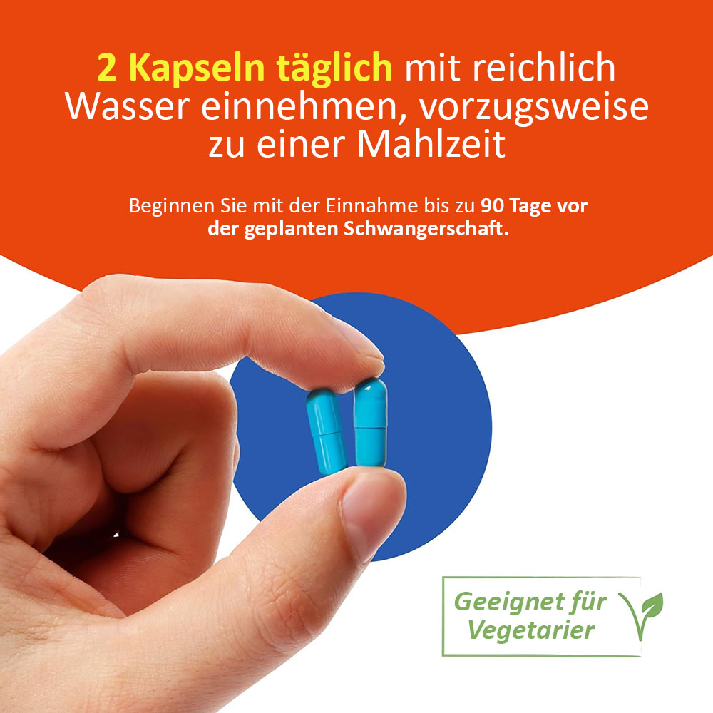 Nimm täglich zwei Kapseln zu einer Mahlzeit ein. Beginne mit der Einnahme bis zu 90 Tage vor der geplanten Schwangerschaft und setze die Einnahme täglich nach Bedarf oder nach Anweisung deines Arztes fort.