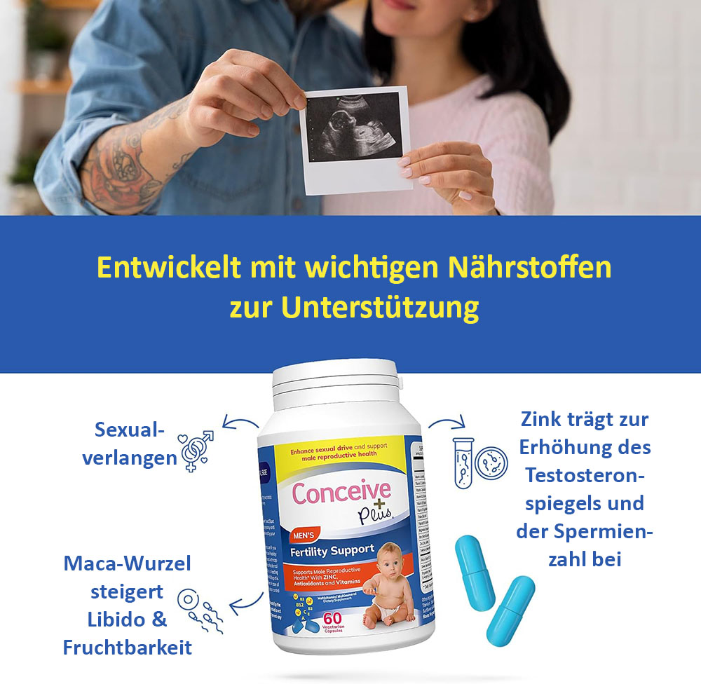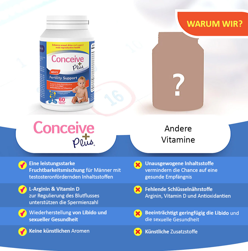 CONCEIVE PLUS® Men’s Fertility Support ist wissenschaftlich formuliert und bietet eine vollständige Kombination aus Antioxidantien, Vitaminen und Mineralien, um die natürliche Fruchtbarkeit zu fördern, das Volumen und die Qualität der Spermienproduktion zu steigern und so die Chancen auf eine Schwangerschaft auf natürliche Weise zu erhöhen – nur für Männer!