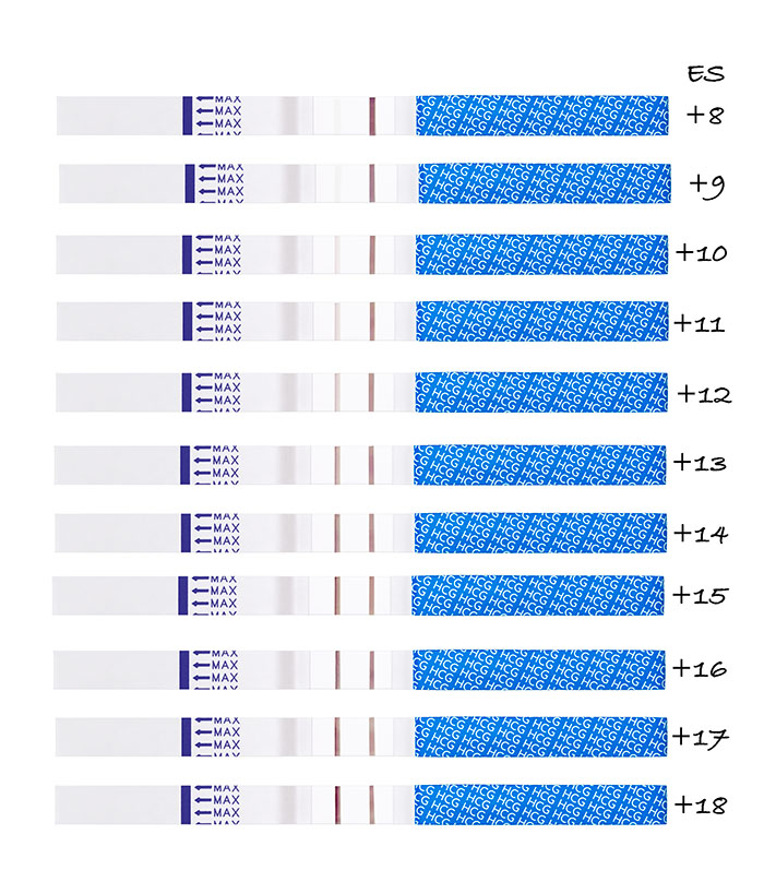 Es hört hier jedoch nicht auf! Unsere Erfahrung hat auch gezeigt, dass es nützlich ist einen positiven Schwangerschaftstest über die kommenden Tage zu wiederholen. So sieht man schön wie das hCG-Hormon sich im Körper entwickelt.